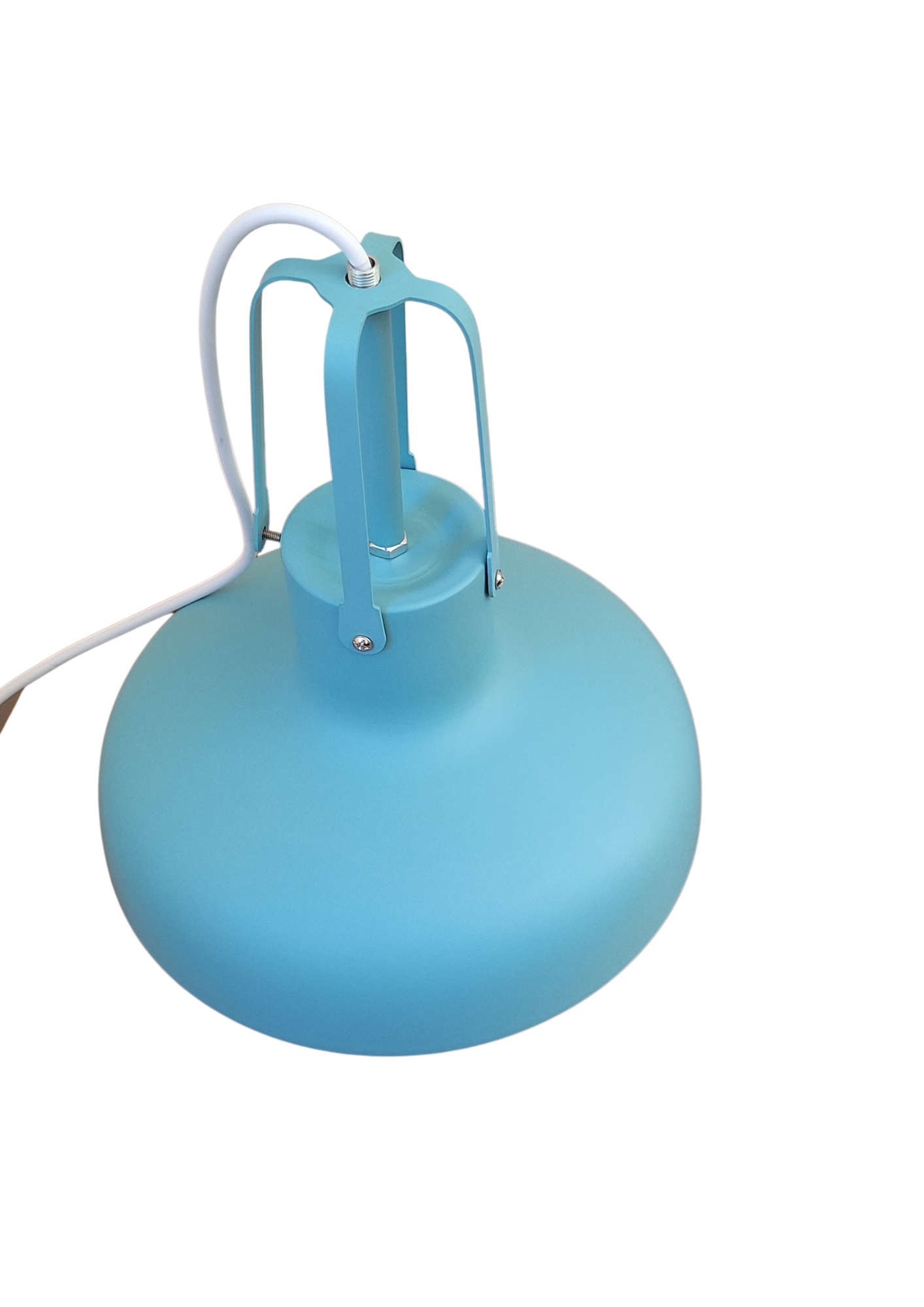 Deze moderne hippe turquoise hanglamp met witte binnenzijde. De hanglamp heeft een diameter van 18 cm als onderste rand en iets daarboven is de diameter 26 cm en een hoogte van 30 cm. Daarnaast is de Scaldare lamp voorzien van een E27 fitting. De lamp is gemaakt van ijzer en is de perfecte hanglamp om boven een tafel te hangen om een hippe , moderne en intieme sfeer te creëren. Ook verkrijgbaar in wit , artikel nr W8002630